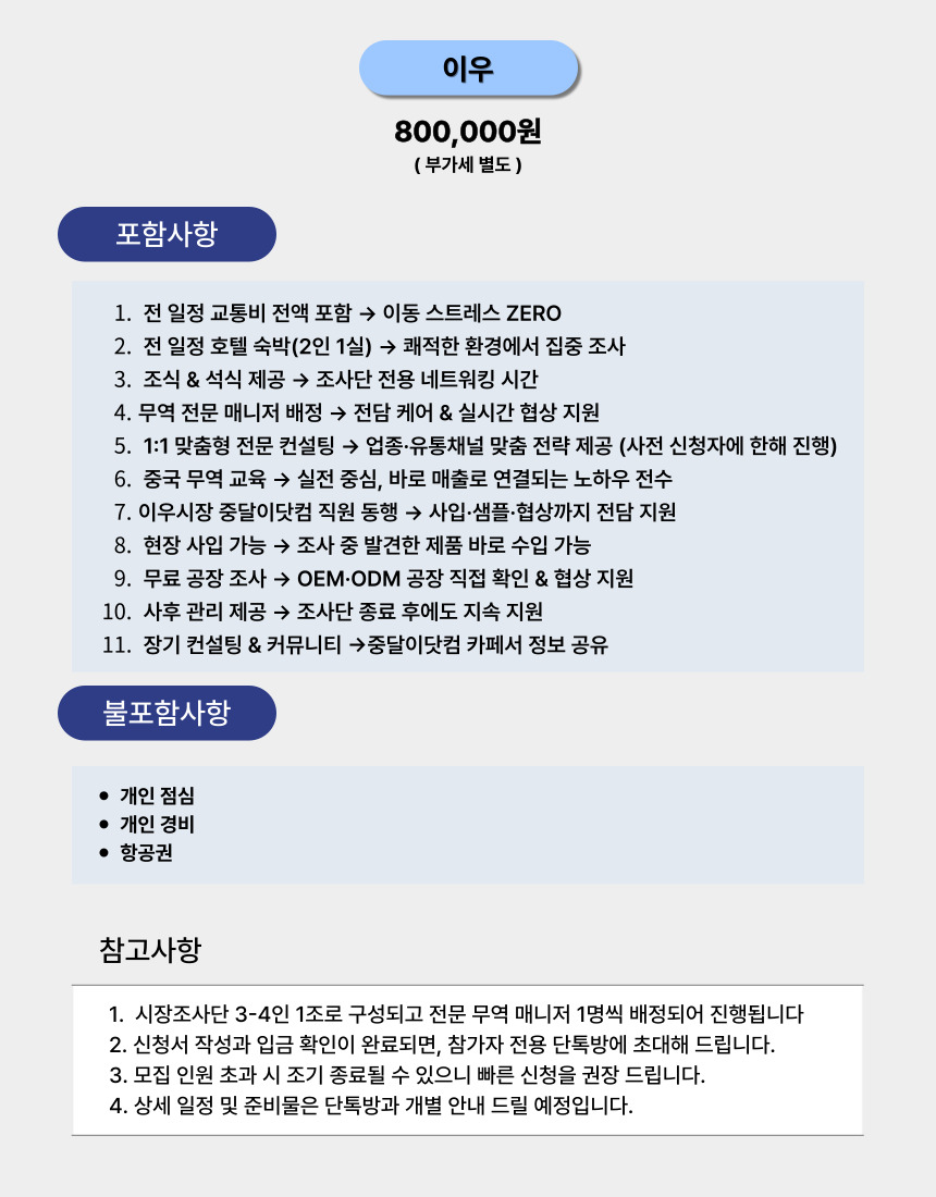- 항공, 숙소, 물류, 사입 교육까지 All-in-One 안내